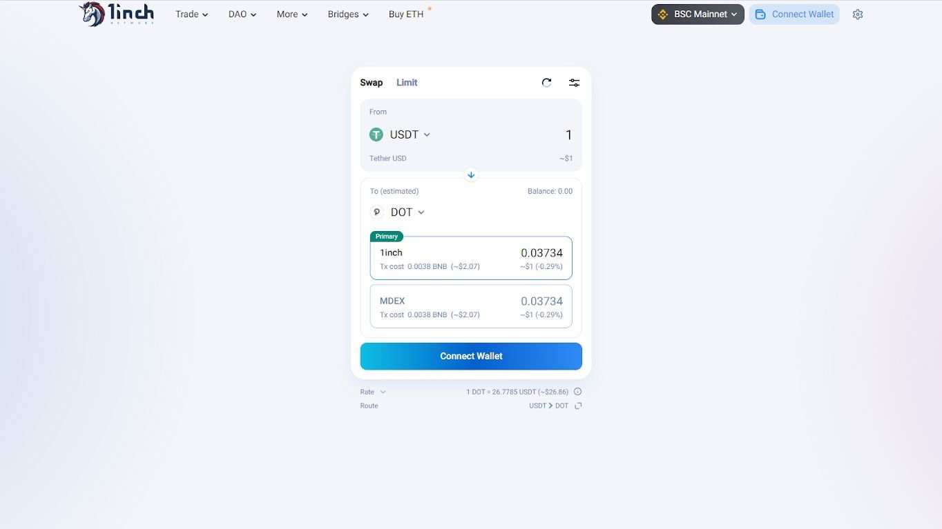 If you already hold different tokens, you can swap them for DOT via decentralized exchange (DEX). This is the advanced user approach. It assumes that you already have a wallet, crypto-funds on it and that you know how to connect your wallet to a DEX. Then you can swap coins you hold for DOT. Binance DEX and 1Inch provide this service. Watch out for availability, as Binance DEX is not offered in a number of countries.